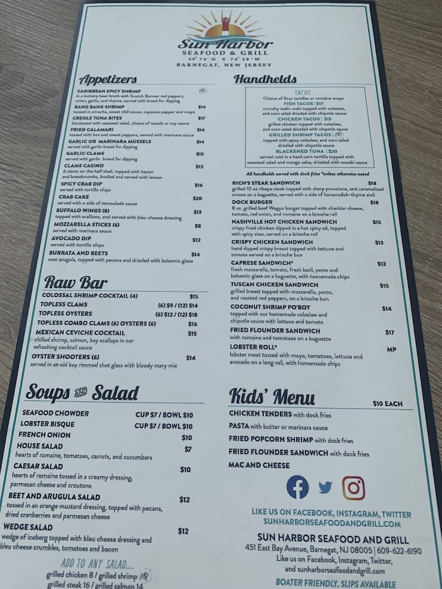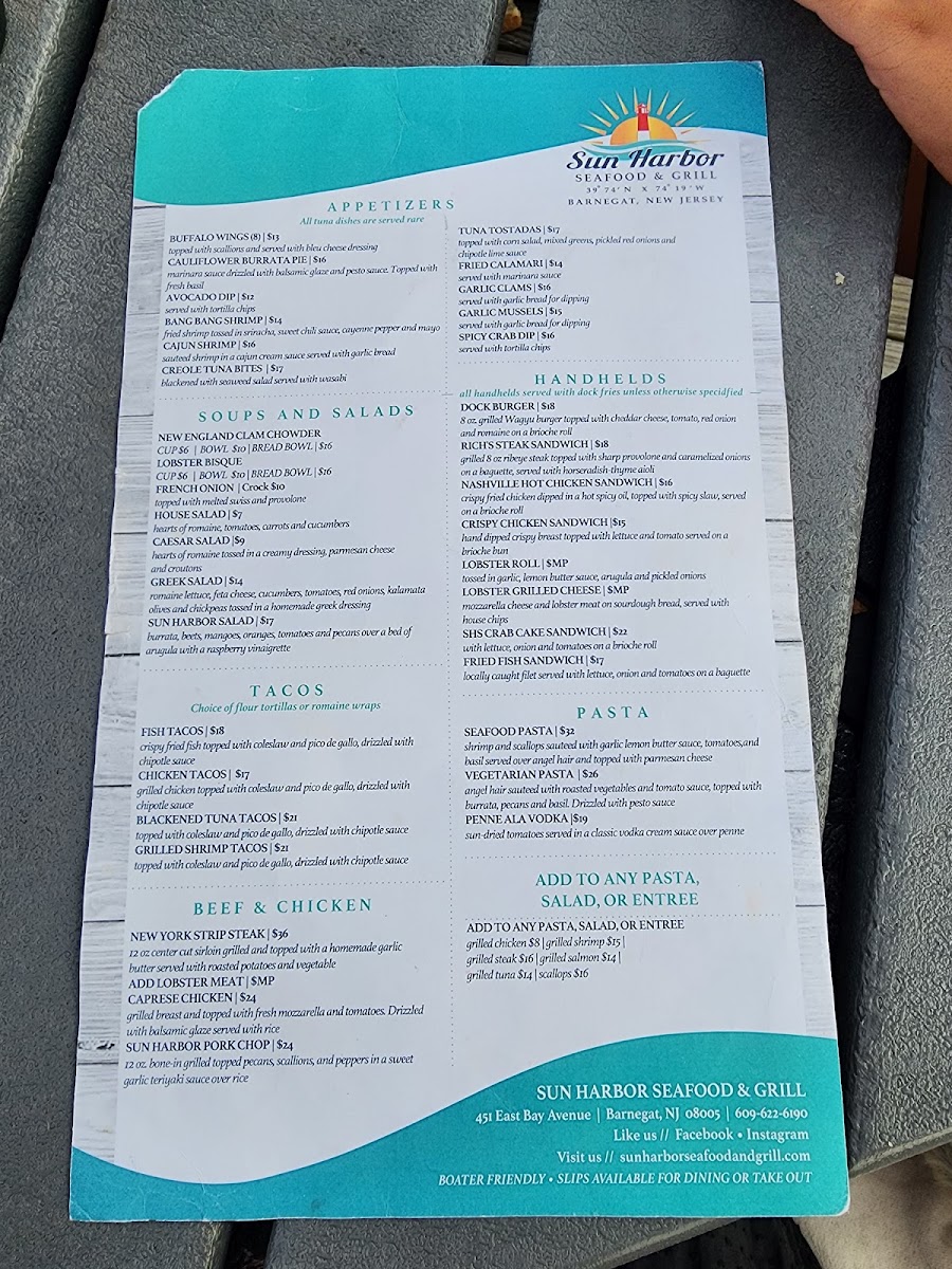 Welcome to Sun Harbor Seafood and Grill, a delightful escape located at 451 E Bay Ave, Barnegat, NJ, where culinary excellence meets breathtaking waterfront views. Our menu is thoughtfully crafted to cater to seafood lovers and grill enthusiasts alike. Start your meal with our Caprese Toast Stack or crispy Fried Calamari that sets the tone for your dining experience. For heartier options, indulge in our signature Hickory Crusted Pub Steak or the decadent Filet Mignon, both grilled to perfection and paired with vibrant sides. Every dish reflects quality and flavor, evident in customer favorites like the blackened tuna and New England Seafood Chowder. The atmosphere is enhanced by live music and a friendly team dedicated to providing outstanding service. Enjoy your meal on the dock or the top deck, all while soaking in the stunning sunset views over the bay. Join us at Sun Harbor for a memorable dining experience!